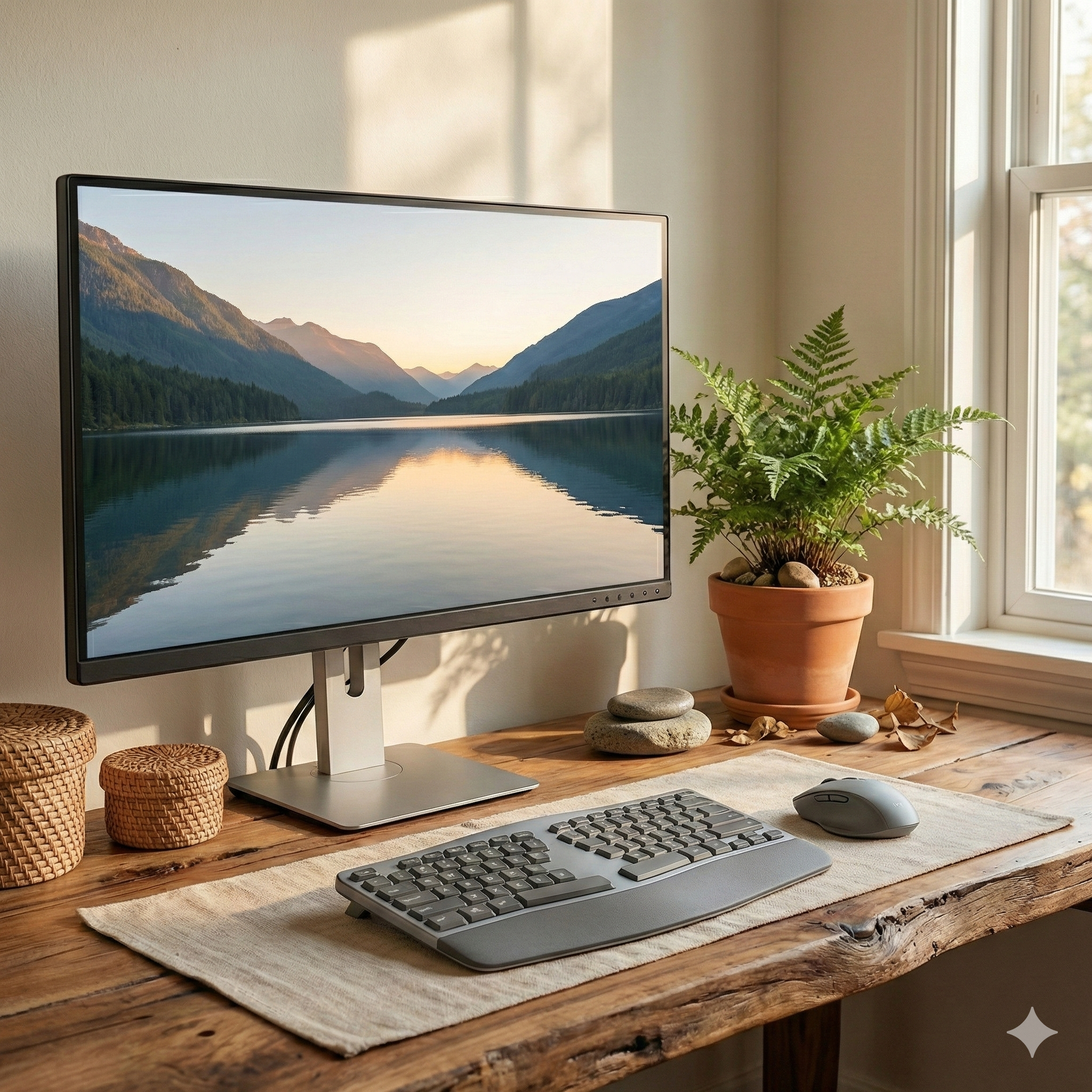- 눈높이 맞추기 (가장 중요): 모니터 화면의 상단 1/3 지점이 사용자의 눈높이와 수평이 되도록 받침대나 모니터 암을 활용해 높여주세요. 고개가 아래로 꺾이는 것을 방지합니다.