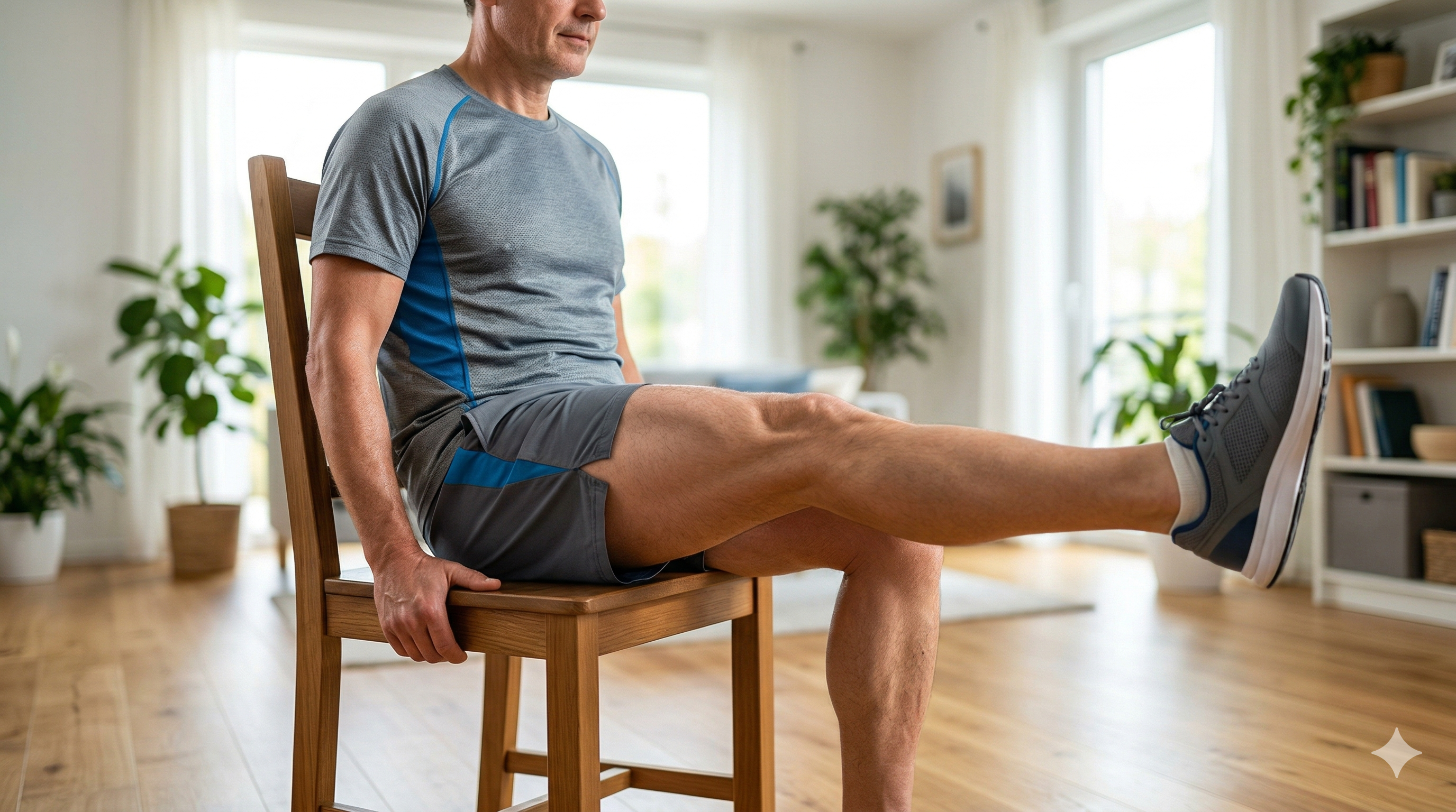 의자에 앉은 상태에서 진행하는 이 방법은 일상생활 중 틈틈이 실천하기 좋습니다. 허벅지 근육의 길이를 유지하면서 근력을 강화하는 데 매우 효과적입니다.
