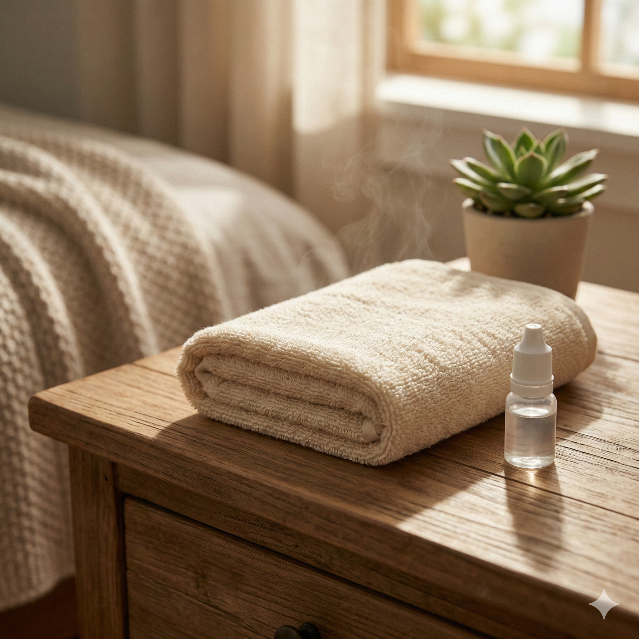 • Step 1: 적정 온도 유지하기 수건에 물을 적셔 전자레인지에 30초 정도 데우거나, 전용 온열 안대를 사용합니다. 화상을 입지 않도록 따뜻한 정도(약 40도)를 유지하세요.